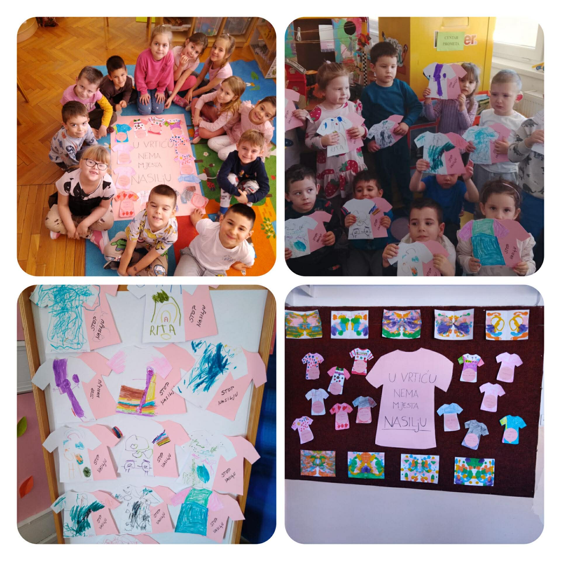U područnom vrtiću Perušić odgojne skupine Različci i Leptirići obilježile su Dan ružičastih majica, poznat i kao Nacionalni dan borbe protiv vršnjačkog nasilja. Djeca su u vedrom i poticajnom ozračju razgovarala o važnosti prijateljstva, poštovanja i međusobnog uvažavanja. Kroz prigodne likovne aktivnosti izrađivali su ružičaste majice, plakate i poruke podrške kojima su poslali jasnu poruku – nasilju nema mjesta u Dječjem vrtiću Pahuljica.