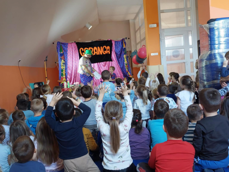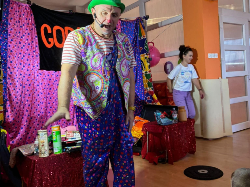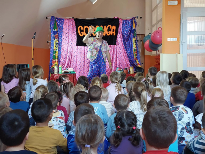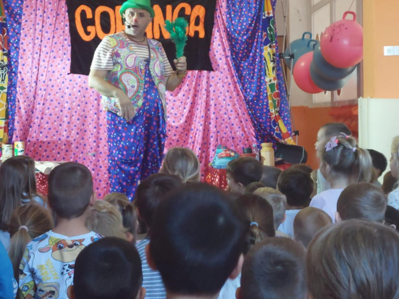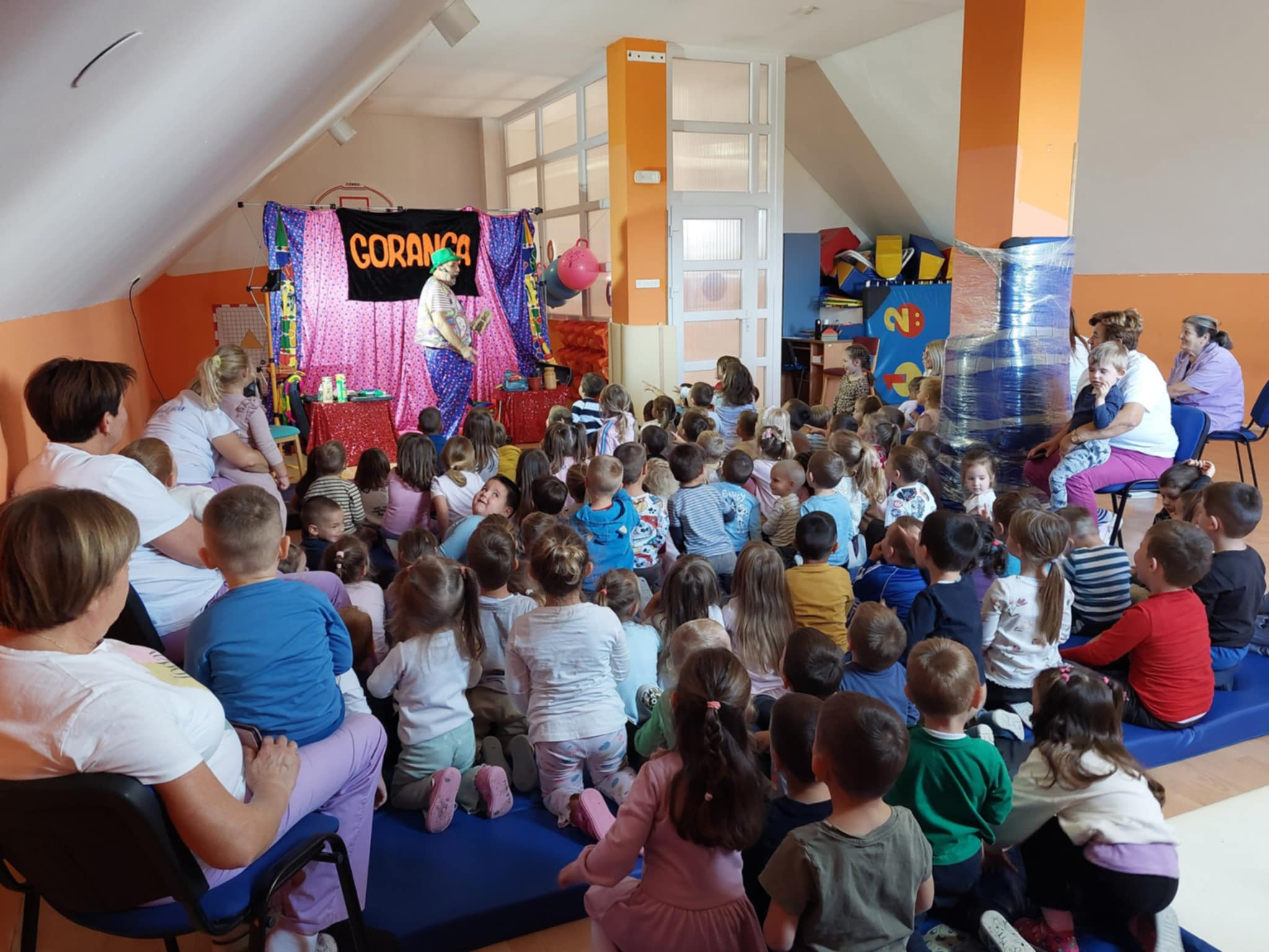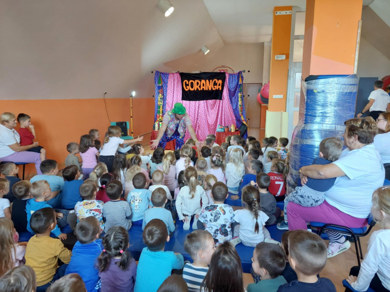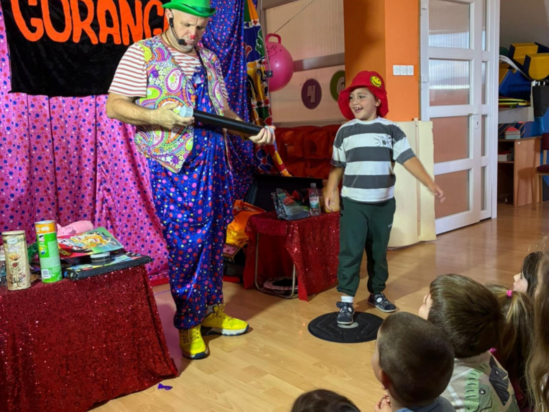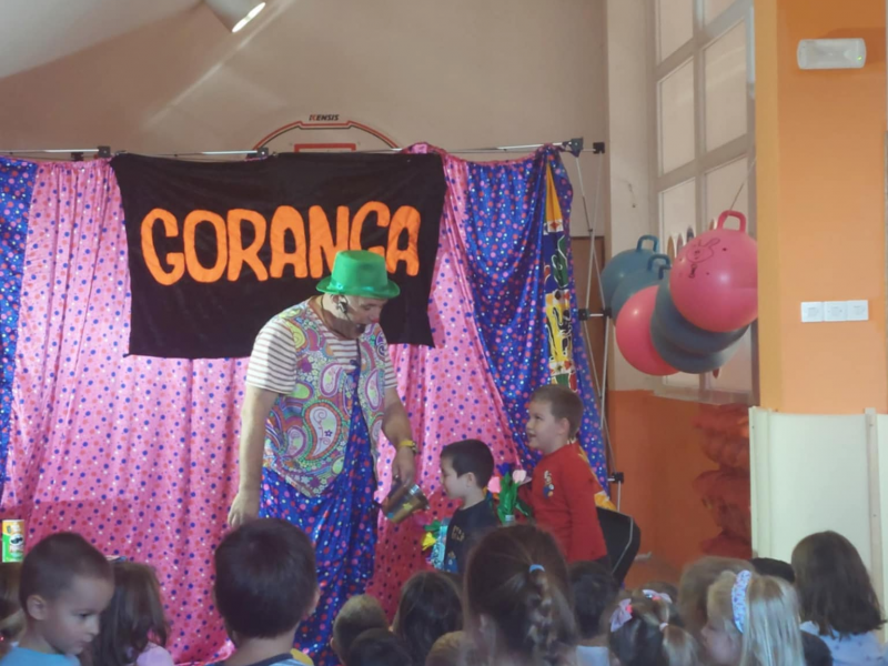 Veseli klaun Goranga, u ulozi „doktora“ specijaliziranog za smijeh i sreću, oduševio je djecu svojim nastupom punim humora, igre i pozitivne energije. Kroz niz komičnih situacija pokazao je mališanima kako smijeh i optimizam mogu biti najbolji lijek za svakodnevne brige i izazove, a ujedno ih podsjetio na važnost pozitivnog stava, zahvalnosti i empatije.